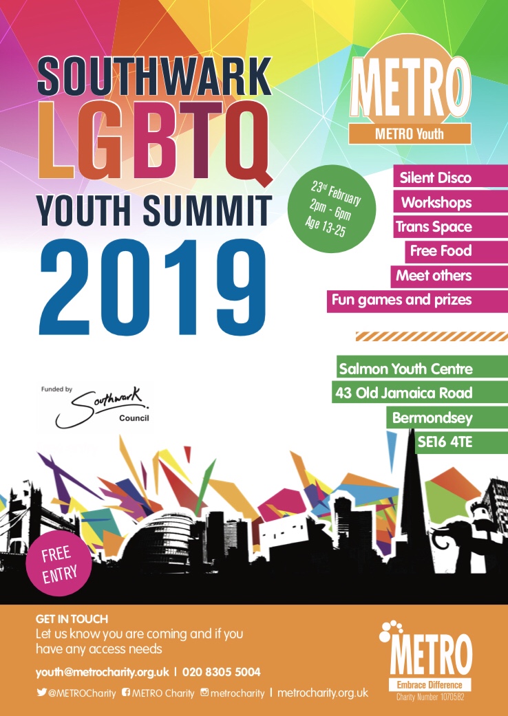 This weekend the Southwark LGBTQ Youth Summit will bring young LGBTQ people (aged 13-25) together to learn about local opportunities and services, socialise and have fun. There will be workshops, trans space, stalls, silent disco, photo booth and much more. Please see the flyer attached for details.