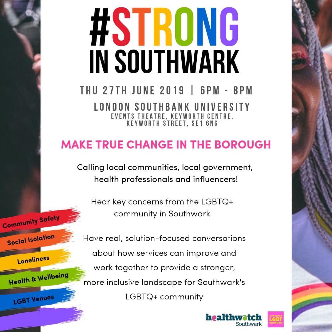 Southwark LGBT Network and Healthwatch Southwark will be launching their new report this month, ‘Strong In Southwark: The Experience of Southwark’s LGBTQ+ Communities‘.