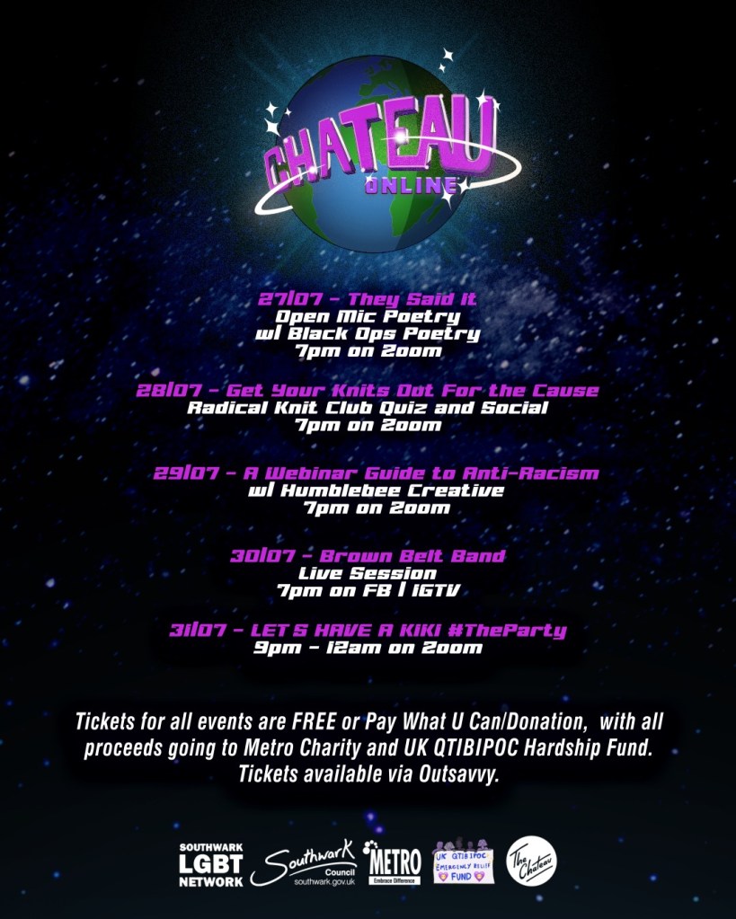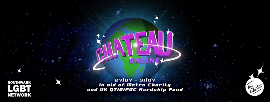 We are very excited to announce a new series of online programming taking place from 27th-31st July. CHATEAU ONLINE will include events, workshops, live sessions and parties to celebrate queer culture and support the LGBTQ+ community in SE London. The events are being organised by the wonderful team at The Chateau, and supported by Southwark LGBT Network.
